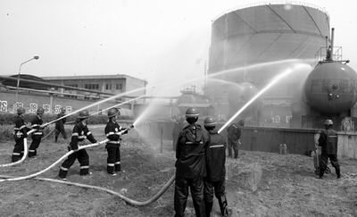 在指揮部的統(tǒng)一指揮下,警戒組、技術(shù)組、滅火組、鋼瓶轉(zhuǎn)移組高速運(yùn)轉(zhuǎn)起來,水帶連接、滅火器到位……一切都在緊張有序地進(jìn)行著,兩條銀色的“水蛇”也急不可待地向罐體的泄漏處飛射而去。