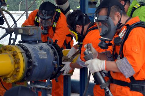 2013年6月20日上午9時(shí),三門峽中裕靈寶末站發(fā)生一起高壓法蘭漏氣事故,靈寶末站值班人員迅速撥打了三門峽中裕應(yīng)急搶險(xiǎn)電話,30分鐘后,著裝整齊的三門峽公司各應(yīng)急搶險(xiǎn)組織人員緊急趕赴現(xiàn)場(chǎng),本著“先控制事態(tài)發(fā)展,再降壓處置”的原則,到達(dá)人員首先拉警戒線、強(qiáng)制通風(fēng)、聯(lián)系上游及用戶、管道降壓……一系列先期工作在搶險(xiǎn)指揮部的統(tǒng)一調(diào)度下緊張有序地實(shí)施……