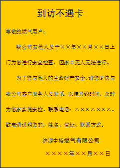 該貼原文為:“下班回家,見(jiàn)門上有一張與其他彩頁(yè)廣告不一樣的紙牌,看后方知是濟(jì)源中裕燃?xì)夤镜陌矙z人員特意留下的到訪不遇卡??ǖ拇笾聝?nèi)容是尊敬的天然氣用戶,我公司安檢人員于某時(shí)間到您家中進(jìn)行安全檢查,因家中無(wú)人無(wú)法進(jìn)行。為了您和他人的生命財(cái)產(chǎn)安全,請(qǐng)您盡快與我公司客戶中心聯(lián)系,以便另約時(shí)間。聯(lián)系電話……小小一片卡,反映出一個(gè)行業(yè)的工作作風(fēng),小小一片卡,大大拉近了供求之間的距離,小小一片卡,異常暖人心?!?